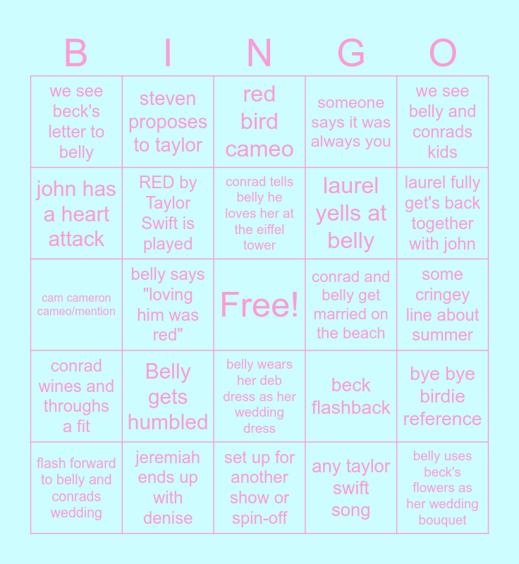 This bingo card has a free space and 24 words: Belly gets humbled, jeremiah ends up with denise, conrad tells belly he loves her at the eiffel tower, flash forward to belly and conrads wedding, we see belly and conrads kids, we see beck's letter to belly, john has a heart attack, steven proposes to taylor, conrad and belly get married on the beach, belly wears her deb dress as her wedding dress, laurel yells at belly, cam cameron cameo/mention, beck flashback, bye bye birdie reference, RED by Taylor Swift is played, any taylor swift song, some cringey line about summer, red bird cameo, laurel fully get's back together with john, belly says "loving him was red", belly uses beck's flowers as her wedding bouquet, conrad wines and throughs a fit, someone says it was always you and set up for another show or spin-off.