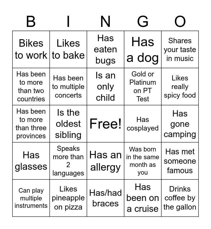 This bingo card has a free space and 24 words: Speaks more than 2 languages, Likes pineapple on pizza, Is an only child, Can play multiple instruments, Shares your taste in music, Bikes to work, Has been to more than two countries, Likes to bake, Has cosplayed, Has an allergy, Gold or Platinum on PT Test, Has been to more than three provinces, Was born in the same month as you, Has met someone famous, Has been to multiple concerts, Has been on a cruise, Has gone camping, Has eaten bugs, Likes really spicy food, Is the oldest sibling, Drinks coffee by the gallon, Has glasses, Has a dog and Has/had braces.