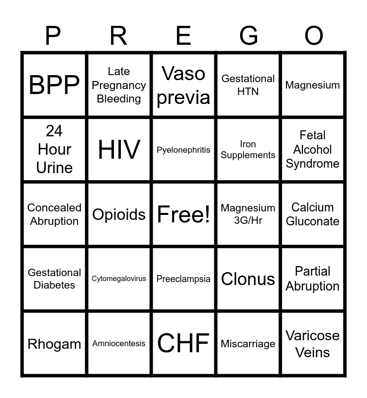 This bingo card has a free space and 54 words: Gestational Hypertension, Gestational Diabetes, HPL, Estrogen, Preeclampsia, Chronic HTN, Gestational HTN, Hyperemesis Gravidarum, 24 Hour Urine, Bed Rest, BPP, AFP, Amniocentesis, Rhogam, Cardiomyopathy, CHF, Varicose Veins, Iron Supplements, Magnesium Toxicity, Calcium Gluconate, Clonus, DTR, Magnesium 3G/Hr, Magnesium, Labetalol, Late Pregnancy Bleeding, Early Pregnancy Bleeding, Ectopic Pregnancy, Hydatidiform Mole, Miscarriage, Insulin, 1 hour GTT, 3 hour GTT, Folic Acid, Vaso previa, Marginal Cord Insertion, Concealed Abruption, Partial Abruption, Placenta Previa, HIV, Toxoplasmosis, Thalassemia, IDA, Rubella, Cytomegalovirus, Syphilis, Herpes Simplex, Group B Strep, Pyelonephritis, Opioids, Fetal Alcohol Syndrome, Prenatal visits, Perimortem C/S and Danger Signs.
