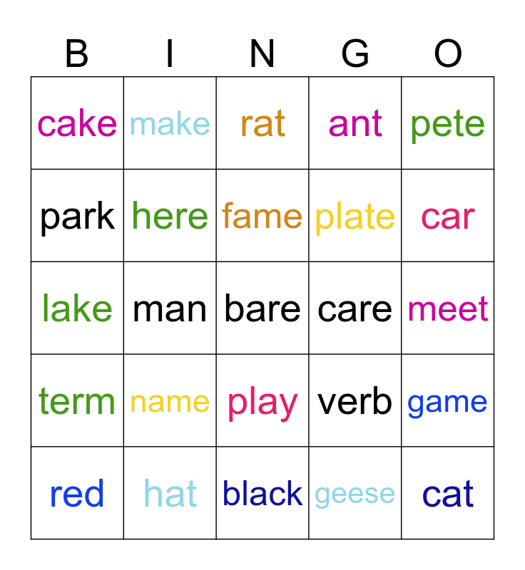 This bingo card has 25 words: name, black, fame, red, pete, cake, park, make, care, play, plate, lake, verb, game, here, cat, meet, rat, car, man, bare, hat, term, ant and geese.