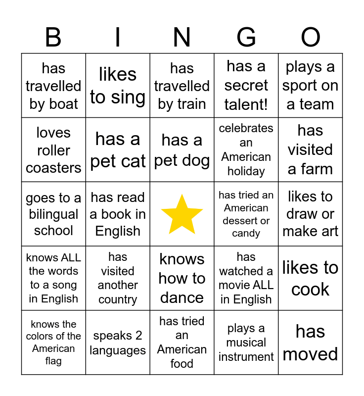 This bingo card has a free space and 24 words: has visited another country, speaks 2 languages, has a pet dog, knows the colors of the American flag, plays a sport on a team, has travelled by boat, loves roller coasters, likes to sing, has tried an American dessert or candy, knows how to dance, celebrates an American holiday, goes to a bilingual school, has watched a movie ALL in English, likes to cook, has a pet cat, plays a musical instrument, likes to draw or make art, has travelled by train, has visited a farm, has read a book in English, has moved, knows ALL the words to a song in English, has a secret talent! and has tried an American food.