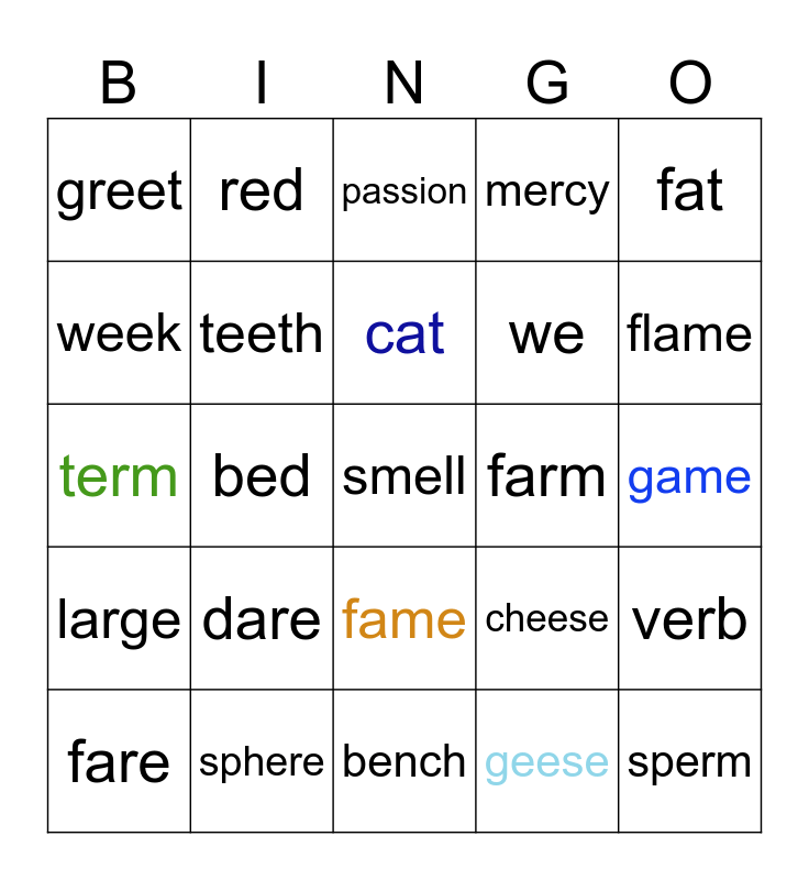 This bingo card has 87 words: name, black, fame, red, pete, cake, park, make, care, play, plate, lake, verb, game, here, cat, meet, rat, car, man, bare, hat, term, ant, geese, arm, dance, hare, name, serve, sphere, mark, dave, dare, week, person, flame, game, bat, bed, mere, we, deep, farm, hat, fat, he, red, she, dare, perfect, green, large, her, me, keen, we, start, mare, mercy, teeth, desk, march, pen, rare, been, shark, fare, smell, sperm, garden, prepare, passion, cheese, eve, chess, share, bench, street, wet, egg, spark, mere, start, leg, greet and square.