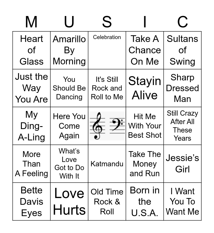 This bingo card has a free space and 60 words: Love Will Keep Us Together, Love Hurts, Come Sail Away, More Than A Feeling, Born in the U.S.A., The Power of Love, You Should Be Dancing, Silly Love Songs, Stayin Alive, How Deep is Your Love, Take A Chance On Me, Livin’ Thing, Just the Way You Are, We Are The Champion, We Will Rock You, Heart of Glass, I Want You To Want Me, Sultans of Swing, The Logical Song, It's Still Rock and Roll to Me, Hit Me With Your Best Shot, Celebration, Bette Davis Eyes, Jessie’s Girl, I Love Rock and Roll, Who Can It Be Now, Abracadabra, Photograph, Sharp Dressed Man, Come on Feel The Noize, Dancing In the Dark, The Gambler, I Love A Rainy Night, Mountain Music, Amarillo By Morning, Don’t It Make My Brown Eyes Blue, Sleeping Single In A Double Bed, Here You Come Again, Always On My Mind, My Ding-A-Ling, Laughter In the Rain, What’s Love Got to Do With It, Still Crazy After All These Years, Gone At Last, Take The Money and Run, Jet Airliner, Jungle Love, Rock and Roll Music, Ghost Riders in the Sky, Katmandu, Old Time Rock & Roll, Centerfold, You Ain’t Seen Nothing Yet, Don’t Bring Me Down, Rock This Town, Late In The Evening, If You Don’t Know Me by Now, Funkytown, Break My Stride and Islands in the Stream.