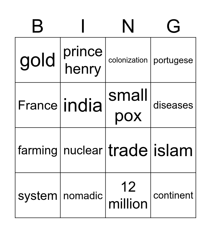This bingo card has 16 words: nomadic, islam, colonization, gold, farming, prince henry, trade, 12 million, France, india, system, portugese, nuclear, diseases, small pox and continent.