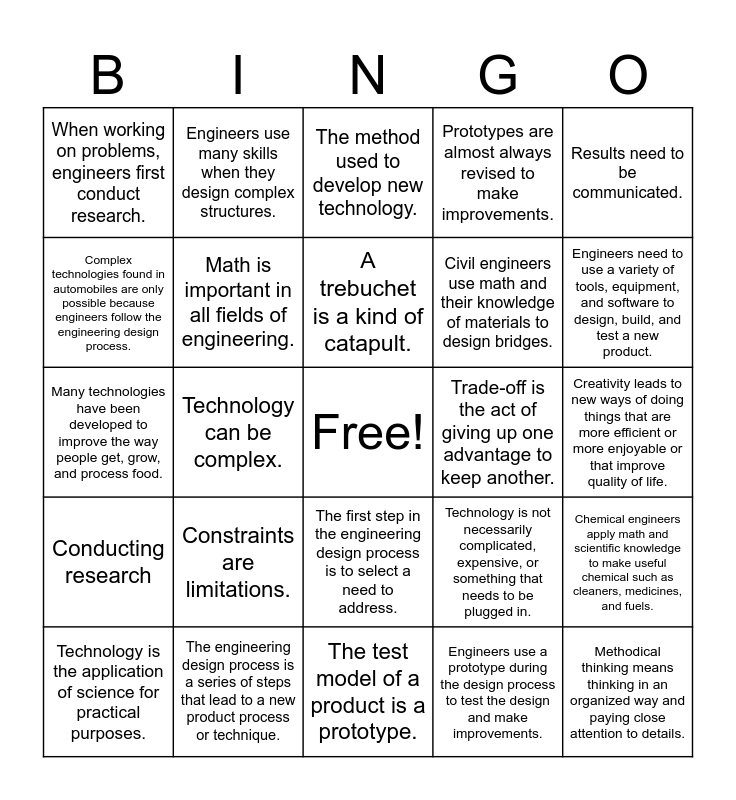 This bingo card has a free space and 29 words: Technology is the application of science for practical purposes., Technology can be simple., Technology can be complex., Engineering is the application of science and math to solve real-life problems., When working on problems, engineers first conduct research., The method used to develop new technology., Math is important in all fields of engineering., Constraints are limitations., Trade-off is the act of giving up one advantage to keep another., The engineering design process is a series of steps that lead to a new product process or technique., Creativity leads to new ways of doing things that are more efficient or more enjoyable or that improve quality of life., Methodical thinking means thinking in an organized way and paying close attention to details., The test model of a product is a prototype., Engineers use a prototype during the design process to test the design and make improvements., Engineers need to use a variety of tools, equipment, and software to design, build, and test a new product., Engineers use scientific knowledge., The first step in the engineering design process is to select a need to address., Conducting research, Results need to be communicated., Many technologies have been developed to improve the way people get, grow, and process food., Technology is not necessarily complicated, expensive, or something that needs to be plugged in., There are many types of engineers., Civil engineers use math and their knowledge of materials to design bridges., Complex technologies found in automobiles are only possible because engineers follow the engineering design process., Prototypes are almost always revised to make improvements., Engineers use many skills when they design complex structures., Chemical engineers apply math and scientific knowledge to make useful chemical such as cleaners, medicines, and fuels., A trebuchet is a kind of catapult. and Complex technologies often use electrical energy..