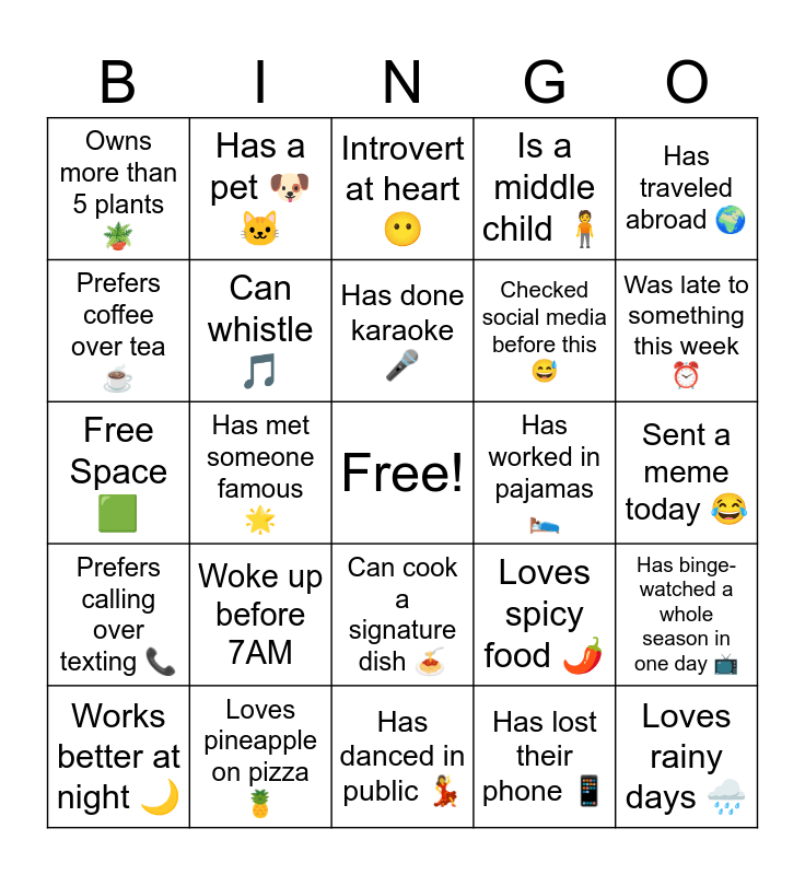 This bingo card has a free space and 24 words: Woke up before 7AM, Loves pineapple on pizza π, Has done karaoke π€, Works better at night π, Has traveled abroad π, Owns more than 5 plants πͺ΄, Prefers coffee over tea β, Has a pet πΆπ±, Has worked in pajamas π, Can cook a signature dish π, Checked social media before this π , Free Space π©, Loves spicy food πΆοΈ, Has binge-watched a whole season in one day πΊ, Can whistle π΅, Has lost their phone π±, Sent a meme today π, Introvert at heart πΆ, Was late to something this week β°, Has met someone famous π, Loves rainy days π§οΈ, Prefers calling over texting π, Is a middle child π§ and Has danced in public π.