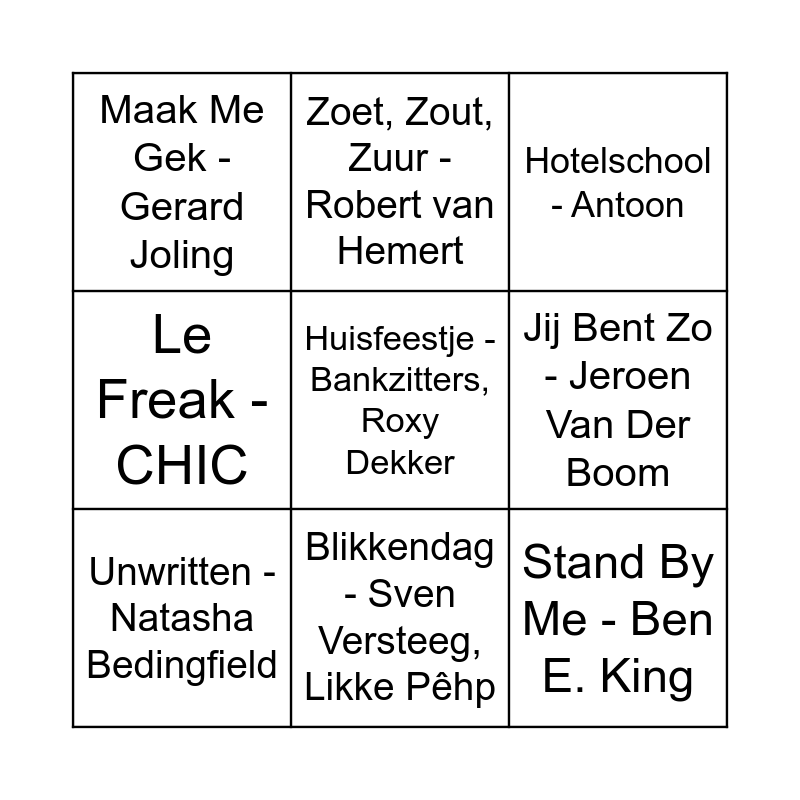 This bingo card has 13 words: Baila de Gasolina - Effe Serieus, Terug In De Tijd - Yves Berendse, Unwritten - Natasha Bedingfield, Zoet, Zout, Zuur - Robert van Hemert, Le Freak - CHIC, Huisfeestje - Bankzitters, Roxy Dekker, Stand By Me - Ben E. King, Disco Inferno - The Trammps, Blikkendag - Sven Versteeg, Likke Pêhp, Maak Me Gek - Gerard Joling, Jij Bent Zo - Jeroen Van Der Boom, Hotelschool - Antoon and Mi Rowsu (Tuintje In Mijn Hart) - Damaru, Jan Smit.