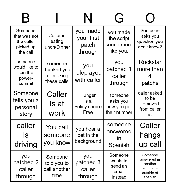 This bingo card has a free space and 24 words: You call someone you know, Someone told you to call another time, you roleplayed with caller, you patched 2 caller through, Someone asks you question you don't know?, Someone that was not the caller picked up the call, someone would like to join the power-summit, Caller is eating lunch/Dinner, someone asks you how you got their number, you hear a pet in the background, you patched 1 caller through, Someone tells you a personal story, someone answered in Spanish, Caller hangs up call, someone thanked you for making these calls, Someone wants to send an email instead, caller asked to be removed from caller list, you made your first patch through, Rockstar more than 4 patchs, Caller is at work, Someone answered in another language outside of spanish, caller is driving, you made the script sound more like you. and you patched 3 caller through.