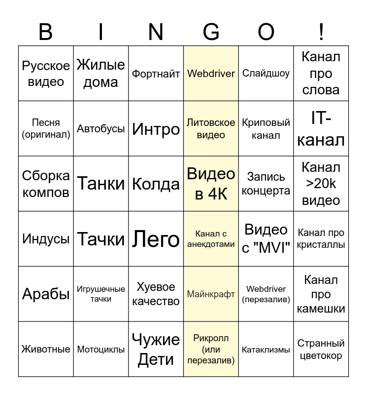 This bingo card has 36 words: Индусы, Тачки, Чужие Дети, Литовское видео, Запись концерта, Канал >20k видео, Русское видео, Мотоциклы, Фортнайт, Майнкрафт, Криповый канал, Канал про слова, Арабы, Танки, Интро, Webdriver, Webdriver (перезалив), Канал про кристаллы, Песня (оригинал), Автобусы, Лего, Канал с анекдотами, Видео с "MVI", Канал про камешки, Сборка компов, Жилые дома, Колда, Рикролл (или перезалив), Слайдшоу, IT-канал, Животные, Игрушечные тачки, Хуевое качество, Видео в 4К, Катаклизмы and Странный цветокор.