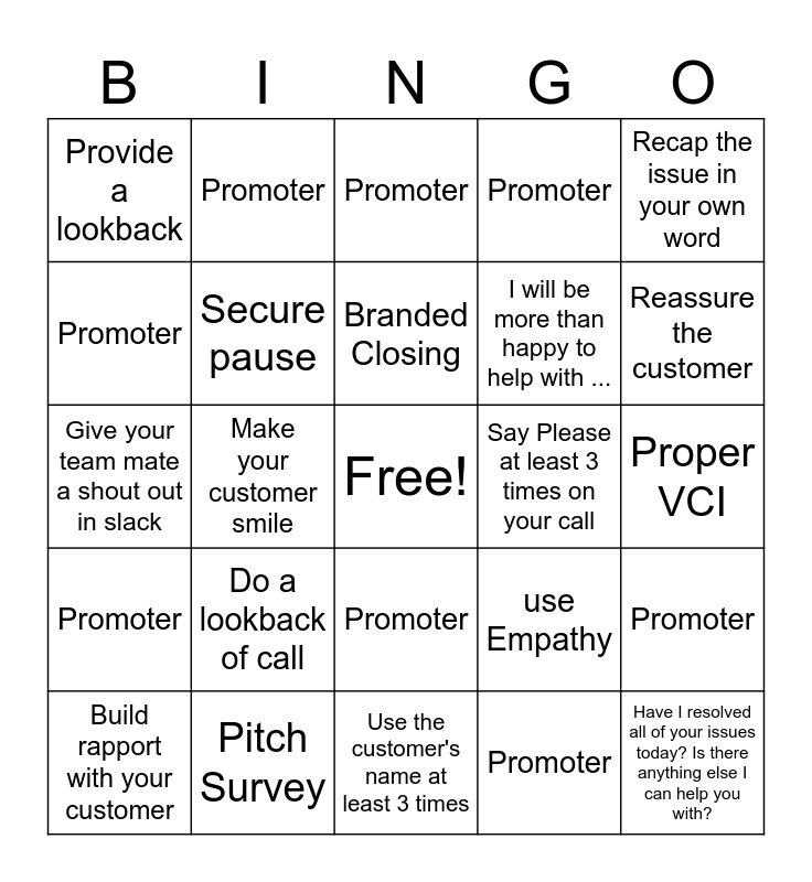 This bingo card has a free space and 29 words: Are you calling about an issue on previously, Pitch Survey, Promoter, Ask about the customer Business, Recap the issue in your own word, Provide a lookback, Secure pause, Branded Closing, Say Please at least 3 times on your call, Promoter, Build rapport with your customer, Make your customer smile, Promoter, Have I resolved all of your issues today? Is there anything else I can help you with?, Give your team mate a shout out in slack, Promoter, Use the customer's name at least 3 times, use Empathy, Reassure the customer, Promoter, Do a lookback of call, Give the customer a compliment, I will be more than happy to help with ..., Proper VCI, Promoter, Promoter, Promoter, Promoter and Promoter.