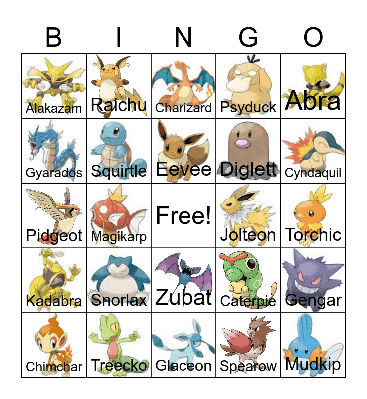 This bingo card has 38 images, a free space and 38 words: Pikachu, Charmander, Bulbasaur, Squirtle, Gengar, Snorlax, Eevee, Greninja, Abra, Diglett, Magikarp, Psyduck, Mudkip, Torchic, Gyarados, Kadabra, Flareon, Charizard, Jigglypuff, Jolteon, Alakazam, Treecko, Cyndaquil, Chimchar, Mewtwo, Glaceon, Charmeleon, Rattata, Machoke, Machamp, Voltorb, Zubat, Spearow, Raichu, Weedle, Caterpie, Pidgeot and Incineroar.