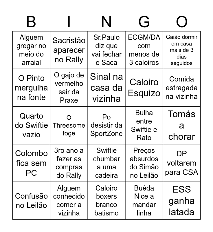 This bingo card has 35 words: Merda com Redes, A Ex do Biotico aparece, TM a sair sem a namorada, O gajo de vermelho sair da Praxe, Swiftie chumbar a uma cadeira, ECGM/DA com menos de 3 caloiros, O Pinto mergulha na fonte, Melão é Presidente, Sinal na casa da vizinha, Encher uma tabua de finos, Quarto do Swiftie vazio, Gaião dormir em casa mais de 3 dias seguidos, Po comer um ser humano, Ir ao Mc depois da Receção, Alguem gregar no meio do arraial, Bulha entre Swiftie e Rato, Buéda Nice a mandar linha, O Threesome foge, Colombo fica sem PC, Po desistir da SportZone, Preços absurdos do Simão no Leilão, Confusão no Leilão, DP voltarem para CSA, Alguem conhecido comer a vizinha, Sr.Paulo diz que vai fechar o Saca, Comida estragada na vizinha, ESS ganha latada, EI passar 1ra Round Battles, Caloiro Esquizo, Tomás a chorar, 20 aparecer a mais de 2 praxes por semana, Caloiro boxers branco batismo, 3ro ano a fazer as compras do Rally, Sacristão aparecer no Rally and Caloiro a gregar no Dom Prior.