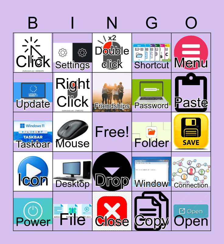 This bingo card has 29 images, a free space and 28 words: Power, Keyboard, Mouse, Cursor, Click, Double click, Right Click, Desktop, Folder, File, Open, Close, Copy, Paste, Drag, Drop, Icon, Menu, Taskbar, Window, Login, Password, Update, Shortcut, Settings, Connection, Friendships and Family.