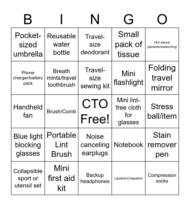 This bingo card has a free space and 24 words: Portable Lint Brush, Mini first aid kit, Travel-size sewing kit, Collapsible sport or utensil set, Hot sauce packets/seasoning, Pocket-sized umbrella, Phone charger/battery pack, Reusable water bottle, Mini lint-free cloth for glasses, Noise canceling earplugs, Mini flashlight, Handheld fan, Notebook, Stain remover pen, Breath mints/travel toothbrush, Lipstick/Chapstick, Stress ball/item, Travel-size deodorant, Folding travel mirror, Brush/Comb, Compression socks, Blue light blocking glasses, Small pack of tissue and Backup headphones.