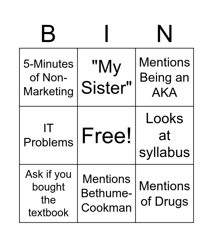 This bingo card has a free space and 10 words: Mentions Bethume-Cookman, Mentions Being an AKA, 5-Minutes of Non-Marketing, Mentions of Drugs, IT Problems, Ask if you bought the textbook, "My Sister", No work assigned, Looks at syllabus and Wears a blazer.