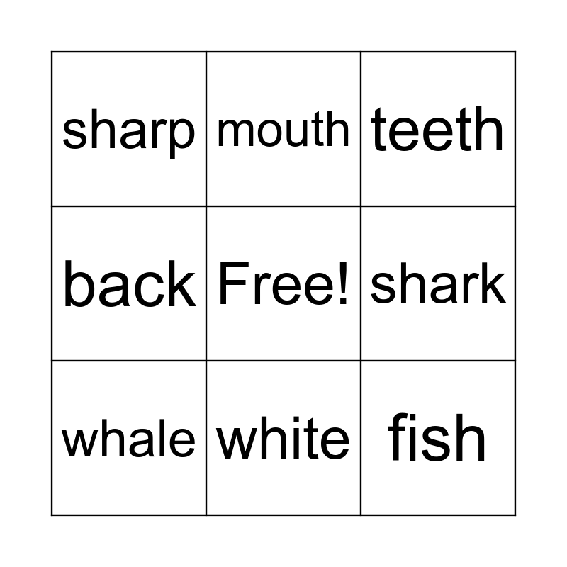 This bingo card has a free space and 8 words: shark, teeth, mouth, whale, sharp, fish, back and white.