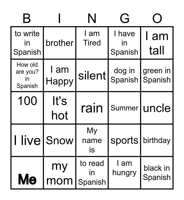 This bingo card has a free space and 32 words: I am hungry, School, It's hot, Spanish Class, I live, I am Happy, I am tall, birthday, brother, she, silent, I am Tired, I like, Monday, Summer, I like to swim, Me, 100, My name is, Snow, sports, It's cold, uncle, my mom, black in Spanish, I have in Spanish, dog in Spanish, How old are you? in Spanish, to write in Spanish, to read in Spanish, to study in Spanish and green in Spanish.