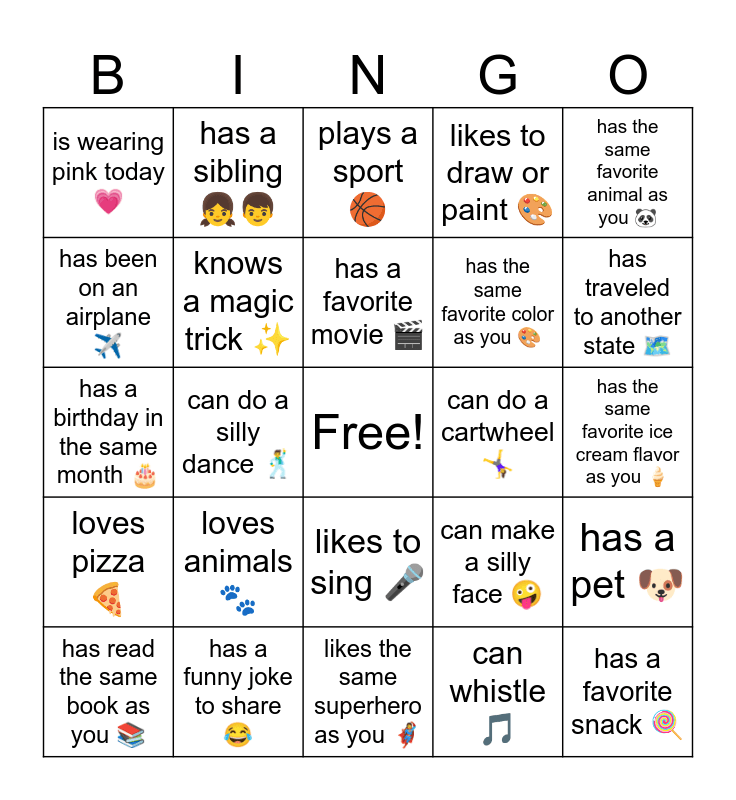 This bingo card has a free space and 28 words: has a pet πΆ, loves to dance π, has the same favorite color as you π¨, can whistle π΅, has been on an airplane βοΈ, plays a sport π, has a sibling π§π¦, loves pizza π, can do a cartwheel π€ΈββοΈ, has read the same book as you π, has a birthday in the same month π, likes to draw or paint π¨, has a funny joke to share π, likes the same superhero as you π¦ΈββοΈ, has traveled to another state πΊοΈ, wears glasses π, loves animals πΎ, knows a magic trick β¨, has a favorite movie π¬, likes to sing π€, is wearing pink today π, wants to be your friend π, has a favorite snack π, can do a silly dance πΊ, has the same favorite ice cream flavor as you π¦, can make a silly face π€ͺ, has the same favorite animal as you πΌ and can count to 10 in a silly voice.