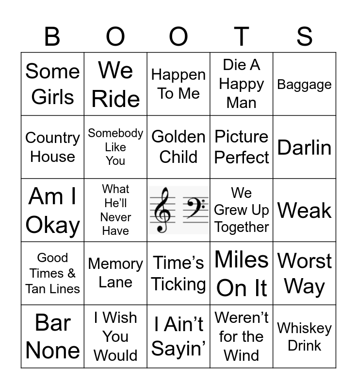 This bingo card has a free space and 60 words: Accidentally Drunk, I Wish You Would, Me & A Beer, Good Times & Tan Lines, Weren’t for the Wind, Straight Line, Somebody Like You, Backup Plan, Picture Perfect, After All The Bars Are Closed, Die A Happy Man, Park, Country House, It Won’t Be Long, Single Again, Some Girls, Whiskey Drink, Baggage, Just In Case, Golden Child, We Grew Up Together, Happen To Me, Bar None, Worst Way, Cowgirl, Best Thing Since Backroads, No Tellin’, Fix What You Didn’t Break, Darlin, Never Call Again, I’m The Problem, What Kinda Man, House Again, 3,2,1, We Ride, Last Night, I Love This Life, What He’ll Never Have, Friends Like That, Am I Okay, Wish You Well, Memory Lane, Weak, Better Me For You, Miles On It, Heavens To Betsy, Wrong Hearts, I Got Better, Easy To Love, Time’s Ticking, I Ain’t Sayin’, Wondering Why, Fast Car, Everything I Love, Next Thing You Know, Liar, Austin, God Gave Me A Girl, Texas Hold ‘Em and Your Place.