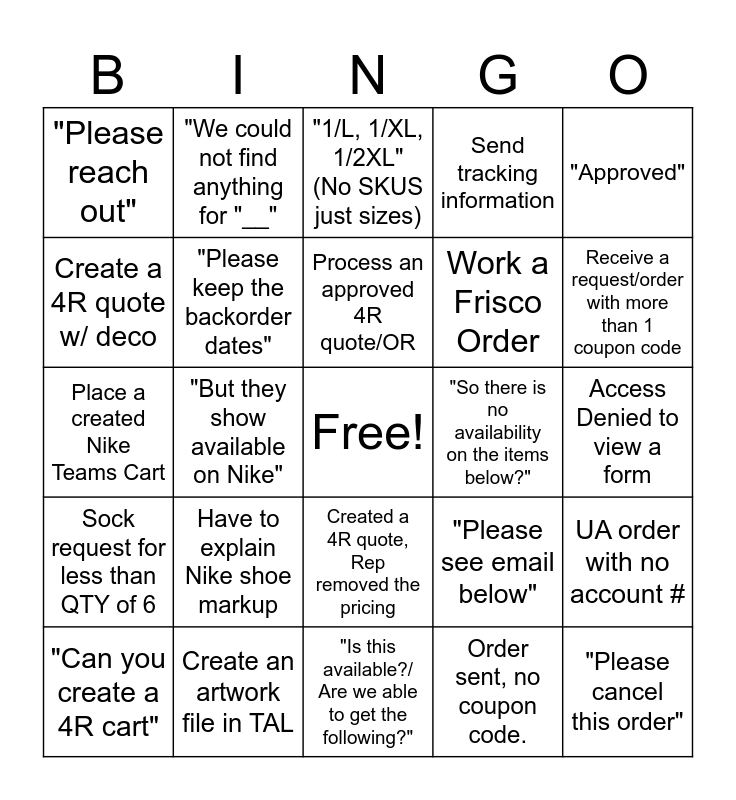 This bingo card has a free space and 31 words: "Is this available?/ Are we able to get the following?", "Coupon Balance?", "But they show available on Nike", "Can I order these?", "Please reach out", "1/L, 1/XL, 1/2XL" (No SKUS just sizes), "Please keep the backorder dates", "Please see email below", "So there is no availability on the items below?", Order sent, no coupon code., Access Denied to view a form, "Please cancel this order", "Has this order shipped?" (You already sent the requestor tracking), Customer is paying for decoration, Receive a request/order with more than 1 coupon code, Backpacks on a Nike Teams order, UA order with no account #, Have to explain Nike shoe markup, Sock request for less than QTY of 6, Created a 4R quote, Rep removed the pricing, "Approved", "Thank you/ You’re the best", "Can you create a 4R cart", "We could not find anything for "__", Work a Frisco Order, Create a 4R quote w/ deco, Send tracking information, Place a created Nike Teams Cart, Create an artwork file in TAL, Process an approved 4R quote/OR and Resolve 3 cases in 1 day.