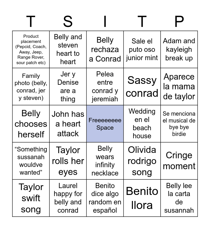 This bingo card has a free space and 29 words: Taylor swift song, Conrad proproses con anillo de Sussanah, John has a heart attack, Belly se siente mal por Jer, Product placement (Pepcid, Coach, Away, Jeep, Range Rover, sour patch etc), Belly rechaza a Conrad, Jer y Denise are a thing, Taylor rolls her eyes, Wedding en el beach house, Laurel happy for belly and conrad, Se menciona el musical de bye bye birdie, Belly lee la carta de susannah, Benito dice algo random en español, Benito llora, Aparece la mama de taylor, Belly swims, Belly wears infinity necklace, “Something sussanah wouldve wanted”, Adam and kayleigh break up, Belly chooses herself, Olivida rodrigo song, Flashback to younger years, Sassy conrad, Family photo (belly, conrad, jer y steven), Sale el puto oso junior mint, Belly and steven heart to heart, Cringe moment, Pelea entre conrad y jeremiah and Salen los hijos de belly y conrad.