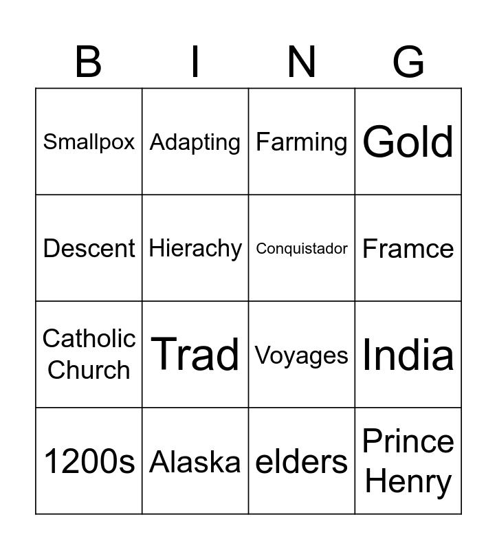 This bingo card has 16 words: Alaska, India, Farming, Smallpox, Catholic Church, Adapting, Voyages, elders, Descent, Hierachy, 1200s, Gold, Trad, Framce, Conquistador and Prince Henry.