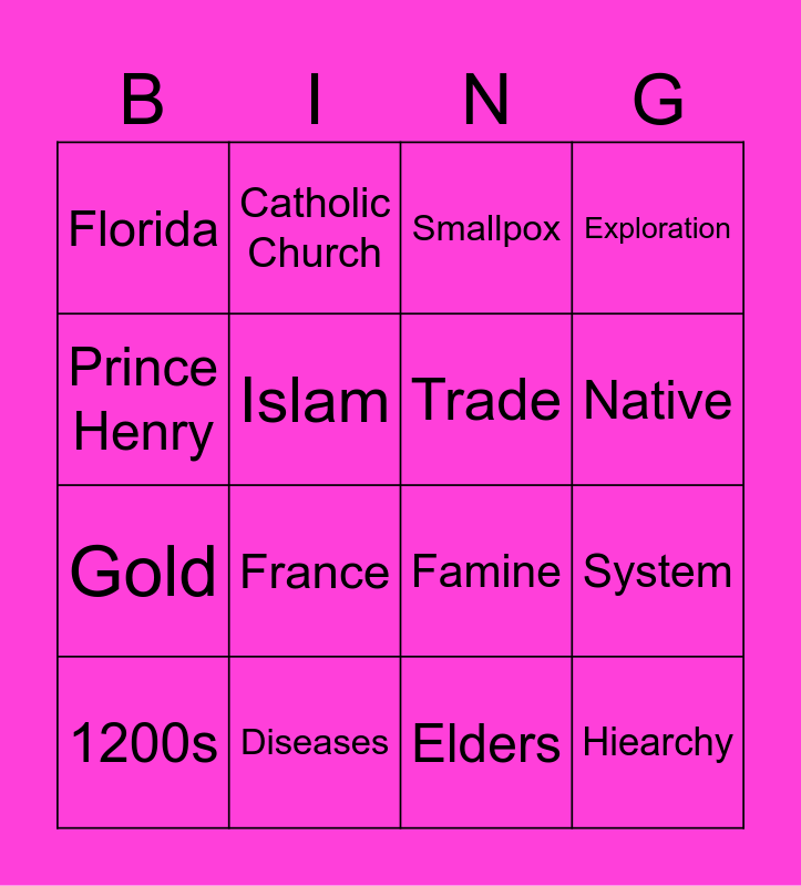 This bingo card has 16 words: Diseases, System, Smallpox, Florida, Gold, Catholic Church, Famine, Elders, Prince Henry, Islam, 1200s, Exploration, France, Native, Trade and Hiearchy.