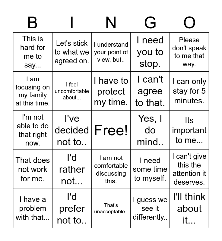 This bingo card has a free space and 29 words: I have a problem with that..., I don't want to..., I've decided not to.., This is what I need..., This is hard for me to say..., I understand your point of view, but.., I feel uncomfortable about..., I'd rather not..., Yes, I do mind.., I'd prefer not to.., Its important to me..., I'll think about it..., That's unacceptable.., I guess we see it differently.., I can only stay for 5 minutes., I respect your perspective, but don't agree., I am not comfortable discussing this., That does not work for me., Please don't speak to me that way., I'm not able to do that right now., I need some time to myself., I need to end this conversation., I can't agree to that., I am focusing on my family at this time., I need you to stop., Let's stick to what we agreed on., I can't give this the attention it deserves., I have to protect my time. and I need some time to think about that..