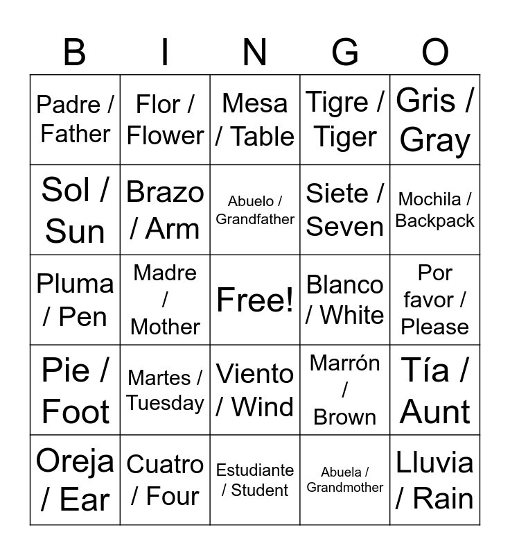 This bingo card has a free space and 100 words: Hola / Hello, Adiós / Goodbye, Por favor / Please, Gracias / Thank you, De nada / You’re welcome, Sí / Yes, No / No, Perdón / Sorry, ¿Qué tal? / How are you?, Bien / Good, Uno / One, Dos / Two, Tres / Three, Cuatro / Four, Cinco / Five, Seis / Six, Siete / Seven, Ocho / Eight, Nueve / Nine, Diez / Ten, Rojo / Red, Azul / Blue, Verde / Green, Amarillo / Yellow, Negro / Black, Blanco / White, Gris / Gray, Marrón / Brown, Naranja / Orange, Rosa / Pink, Madre / Mother, Padre / Father, Hermano / Brother, Hermana / Sister, Abuela / Grandmother, Abuelo / Grandfather, Tía / Aunt, Tío / Uncle, Primo / Cousin (male), Prima / Cousin (female), Libro / Book, Lápiz / Pencil, Pluma / Pen, Papel / Paper, Mochila / Backpack, Mesa / Table, Silla / Chair, Maestro / Teacher (male), Maestra / Teacher (female), Estudiante / Student, Perro / Dog, Gato / Cat, Pájaro / Bird, Pez / Fish, Caballo / Horse, Vaca / Cow, Cerdo / Pig, Oveja / Sheep, León / Lion, Tigre / Tiger, Pan / Bread, Agua / Water, Leche / Milk, Manzana / Apple, Plátano / Banana, Naranja / Orange (fruit), Pollo / Chicken, Arroz / Rice, Queso / Cheese, Huevos / Eggs, Lunes / Monday, Martes / Tuesday, Miércoles / Wednesday, Jueves / Thursday, Viernes / Friday, Sábado / Saturday, Domingo / Sunday, Sol / Sun, Luna / Moon, Estrella / Star, Nube / Cloud, Lluvia / Rain, Nieve / Snow, Viento / Wind, Árbol / Tree, Flor / Flower, Mar / Sea, Cabeza / Head, Mano / Hand, Pie / Foot, Ojo / Eye, Boca / Mouth, Nariz / Nose, Oreja / Ear, Brazo / Arm, Pierna / Leg, Corazón / Heart, Casa / House, Amigo / Friend and Escuela / School.