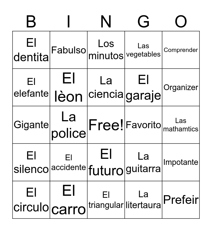 This bingo card has a free space and 24 words: El accidente, El carro, La ciencia, El circulo, Comprender, El dentita, El elefante, Fabulso, Favorito, El futuro, El garaje, Gigante, La guitarra, Impotante, El lèon, La litertaura, Las mathamtics, Los minutos, Organizer, La police, Prefeir, El silenco, Las vegetables and El triangular.