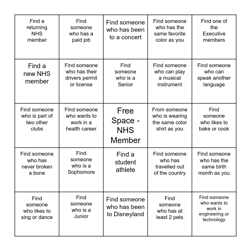 This bingo card has a free space and 24 words: Find someone who is a Sophomore, Find someone who is a Junior, Find someone who is a Senior, Find someone who likes to sing or dance, Find one of the Executive members, Find a returning NHS member, Find a new NHS member, Find someone who has a paid job, From someone who is wearing the same color shirt as you, Find a student athlete, Find someone who can play a musical instrument, Find someone who is part of two other clubs, Find someone who has travelled out of the country, Find someone who has the same birth month as you, Find someone who has their drivers permit or license, Find someone who has at least 2 pets, Find someone who likes to bake or cook, Find someone who has been to a concert, Find someone who can speak another language, Find someone who wants to work in a health career, Find someone who wants to work in engineering or technology, Find someone who has never broken a bone, Find someone who has the same favorite color as you and Find someone who has been to Disneyland.