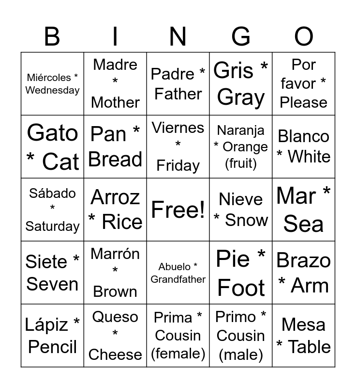 This bingo card has a free space and 101 words: Hola * Hello, Adiós * Goodbye, Por favor * Please, Gracias * Thank you, De nada * You’re welcome, Sí * Yes, No * No, Perdón * Sorry, ¿Qué tal? * How are you?, Bien * Good, Uno * One, Dos * Two, Tres * Three, Cuatro * Four, Cinco * Five, Seis * Six, Siete * Seven, Ocho * Eight, Nueve * Nine, Diez * Ten, Rojo * Red, Azul * Blue, Verde * Green, Amarillo * Yellow, Negro * Black, Blanco * White, Gris * Gray, Marrón * Brown, Naranja * Orange, Rosa * Pink, Madre * Mother, Padre * Father, Hermano * Brother, Hermana * Sister, Abuela * Grandmother, Abuelo * Grandfather, Tía * Aunt, Tío * Uncle, Primo * Cousin (male), Prima * Cousin (female), Libro * Book, Lápiz * Pencil, Pluma * Pen, Papel * Paper, Mochila * Backpack, Mesa * Table, Silla * Chair, Maestro * Teacher (male), Maestra * Teacher (female), Estudiante * Student, Perro * Dog, Gato * Cat, Pájaro * Bird, Pez * Fish, Caballo * Horse, Vaca * Cow, Cerdo * Pig, Oveja * Sheep, León * Lion, Tigre * Tiger, Pan * Bread, Agua * Water, Leche * Milk, Manzana * Apple, Plátano * Banana, Naranja * Orange (fruit), Pollo * Chicken, Arroz * Rice, Queso * Cheese, Huevos * Eggs, Lunes * Monday, Martes * Tuesday, Miércoles * Wednesday, Jueves * Thursday, Viernes * Friday, Sábado * Saturday, Domingo * Sunday, Sol * Sun, Luna * Moon, Estrella * Star, Nube * Cloud, Lluvia * Rain, Nieve * Snow, Viento * Wind, Árbol * Tree, Flor * Flower, Mar * Sea, Body Parts, Cabeza * Head, Mano * Hand, Pie * Foot, Ojo * Eye, Boca * Mouth, Nariz * Nose, Oreja * Ear, Brazo * Arm, Pierna * Leg, Corazón * Heart, Casa * House, Amigo * Friend and Escuela * School.