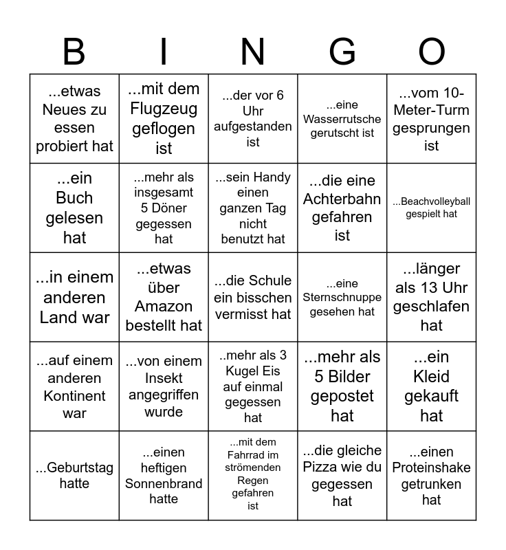 This bingo card has a free space and 24 words: ...von einem Insekt angegriffen wurde, ...einen heftigen Sonnenbrand hatte, ...sein Handy einen ganzen Tag nicht benutzt hat, ...Geburtstag hatte, ...vom 10-Meter-Turm gesprungen ist, ...etwas Neues zu essen probiert hat, ...ein Buch gelesen hat, ...mit dem Flugzeug geflogen ist, ...eine Sternschnuppe gesehen hat, ..mehr als 3 Kugel Eis auf einmal gegessen hat, ...die eine Achterbahn gefahren ist, ...in einem anderen Land war, ...mehr als 5 Bilder gepostet hat, ...ein Kleid gekauft hat, ...mehr als insgesamt 5 Döner gegessen hat, ...die gleiche Pizza wie du gegessen hat, ...länger als 13 Uhr geschlafen hat, ...der vor 6 Uhr aufgestanden ist, ...Beachvolleyball gespielt hat, ...etwas über Amazon bestellt hat, ...einen Proteinshake getrunken hat, ...auf einem anderen Kontinent war, ...eine Wasserrutsche gerutscht ist and ...mit dem Fahrrad im strömenden Regen gefahren ist.