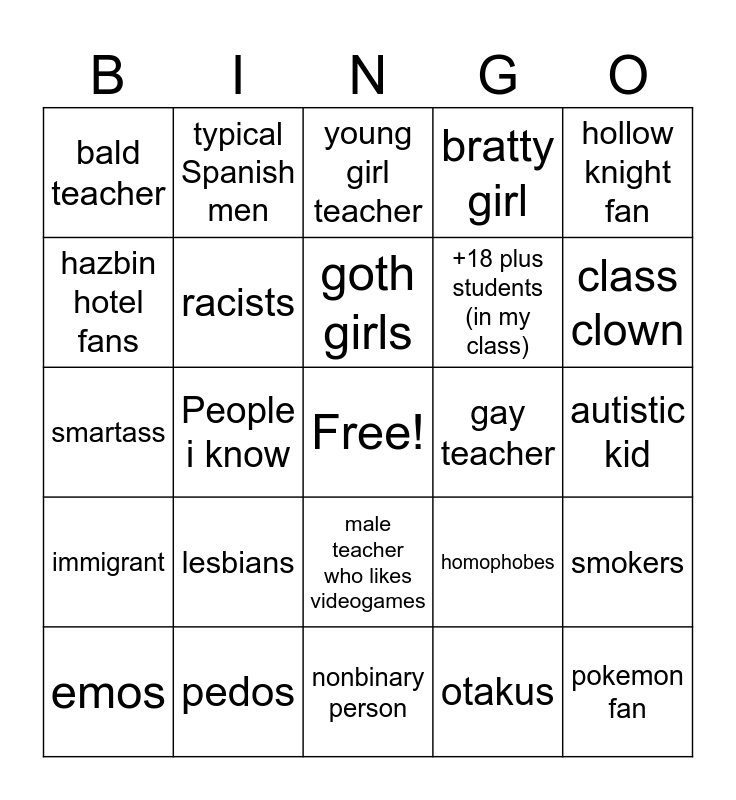 This bingo card has a free space and 24 words: emos, lesbians, goth girls, otakus, hollow knight fan, bald teacher, typical Spanish men, young girl teacher, gay teacher, autistic kid, smartass, racists, homophobes, smokers, hazbin hotel fans, pedos, nonbinary person, bratty girl, class clown, immigrant, People i know, male teacher who likes videogames, +18 plus students (in my class) and pokemon fan.