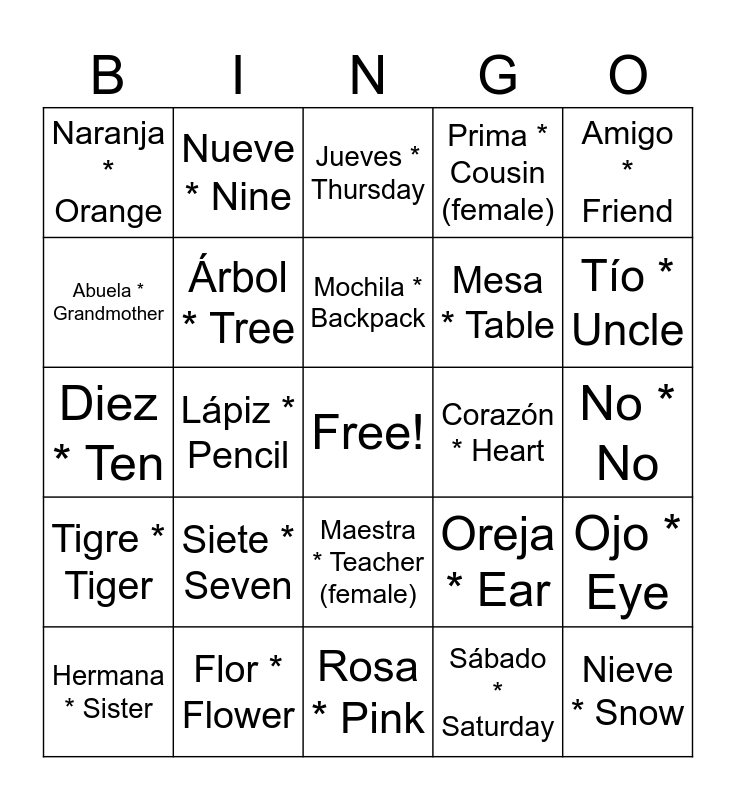 This bingo card has a free space and 98 words: Gracias * Thank you, De nada * You’re welcome, Sí * Yes, No * No, Perdón * Sorry, ¿Qué tal? * How are you?, Bien * Good, Uno * One, Dos * Two, Tres * Three, Cuatro * Four, Cinco * Five, Seis * Six, Siete * Seven, Ocho * Eight, Nueve * Nine, Diez * Ten, Rojo * Red, Azul * Blue, Verde * Green, Amarillo * Yellow, Negro * Black, Blanco * White, Gris * Gray, Marrón * Brown, Naranja * Orange, Rosa * Pink, Madre * Mother, Padre * Father, Hermano * Brother, Hermana * Sister, Abuela * Grandmother, Abuelo * Grandfather, Tía * Aunt, Tío * Uncle, Primo * Cousin (male), Prima * Cousin (female), Libro * Book, Lápiz * Pencil, Pluma * Pen, Papel * Paper, Mochila * Backpack, Mesa * Table, Silla * Chair, Maestro * Teacher (male), Maestra * Teacher (female), Estudiante * Student, Perro * Dog, Gato * Cat, Pájaro * Bird, Pez * Fish, Caballo * Horse, Vaca * Cow, Cerdo * Pig, Oveja * Sheep, León * Lion, Tigre * Tiger, Pan * Bread, Agua * Water, Leche * Milk, Manzana * Apple, Plátano * Banana, Naranja * Orange (fruit), Pollo * Chicken, Arroz * Rice, Queso * Cheese, Huevos * Eggs, Lunes * Monday, Martes * Tuesday, Miércoles * Wednesday, Jueves * Thursday, Viernes * Friday, Sábado * Saturday, Domingo * Sunday, Sol * Sun, Luna * Moon, Estrella * Star, Nube * Cloud, Lluvia * Rain, Nieve * Snow, Viento * Wind, Árbol * Tree, Flor * Flower, Mar * Sea, Body Parts, Cabeza * Head, Mano * Hand, Pie * Foot, Ojo * Eye, Boca * Mouth, Nariz * Nose, Oreja * Ear, Brazo * Arm, Pierna * Leg, Corazón * Heart, Casa * House, Amigo * Friend and Escuela * School.