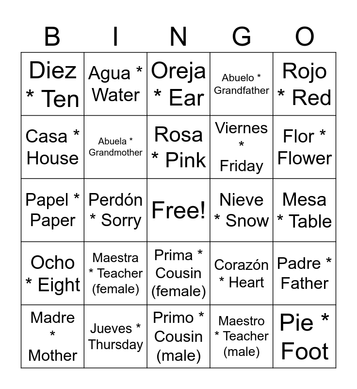 This bingo card has a free space and 97 words: De nada * You’re welcome, Sí * Yes, No * No, Perdón * Sorry, ¿Qué tal? * How are you?, Bien * Good, Uno * One, Dos * Two, Tres * Three, Cuatro * Four, Cinco * Five, Seis * Six, Siete * Seven, Ocho * Eight, Nueve * Nine, Diez * Ten, Rojo * Red, Azul * Blue, Verde * Green, Amarillo * Yellow, Negro * Black, Blanco * White, Gris * Gray, Marrón * Brown, Naranja * Orange, Rosa * Pink, Madre * Mother, Padre * Father, Hermano * Brother, Hermana * Sister, Abuela * Grandmother, Abuelo * Grandfather, Tía * Aunt, Tío * Uncle, Primo * Cousin (male), Prima * Cousin (female), Libro * Book, Lápiz * Pencil, Pluma * Pen, Papel * Paper, Mochila * Backpack, Mesa * Table, Silla * Chair, Maestro * Teacher (male), Maestra * Teacher (female), Estudiante * Student, Perro * Dog, Gato * Cat, Pájaro * Bird, Pez * Fish, Caballo * Horse, Vaca * Cow, Cerdo * Pig, Oveja * Sheep, León * Lion, Tigre * Tiger, Pan * Bread, Agua * Water, Leche * Milk, Manzana * Apple, Plátano * Banana, Naranja * Orange (fruit), Pollo * Chicken, Arroz * Rice, Queso * Cheese, Huevos * Eggs, Lunes * Monday, Martes * Tuesday, Miércoles * Wednesday, Jueves * Thursday, Viernes * Friday, Sábado * Saturday, Domingo * Sunday, Sol * Sun, Luna * Moon, Estrella * Star, Nube * Cloud, Lluvia * Rain, Nieve * Snow, Viento * Wind, Árbol * Tree, Flor * Flower, Mar * Sea, Body Parts, Cabeza * Head, Mano * Hand, Pie * Foot, Ojo * Eye, Boca * Mouth, Nariz * Nose, Oreja * Ear, Brazo * Arm, Pierna * Leg, Corazón * Heart, Casa * House, Amigo * Friend and Escuela * School.