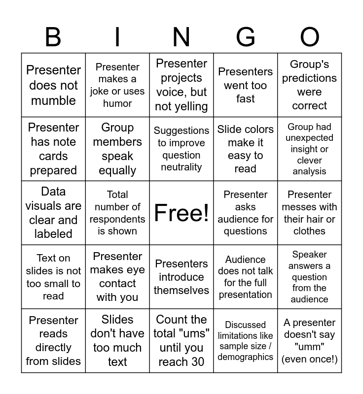 This bingo card has a free space and 24 words: Presenter makes eye contact with you, Slides don't have too much text, Suggestions to improve question neutrality, Presenter reads directly from slides, Group's predictions were correct, Presenter does not mumble, Presenter has note cards prepared, Presenter makes a joke or uses humor, Presenter asks audience for questions, Presenters introduce themselves, Slide colors make it easy to read, Data visuals are clear and labeled, Audience does not talk for the full presentation, Speaker answers a question from the audience, Group members speak equally, Discussed limitations like sample size / demographics, Presenter messes with their hair or clothes, Presenter projects voice, but not yelling, Group had unexpected insight or clever analysis, Total number of respondents is shown, A presenter doesn't say "umm" (even once!), Text on slides is not too small to read, Presenters went too fast and Count the total "ums" until you reach 30.