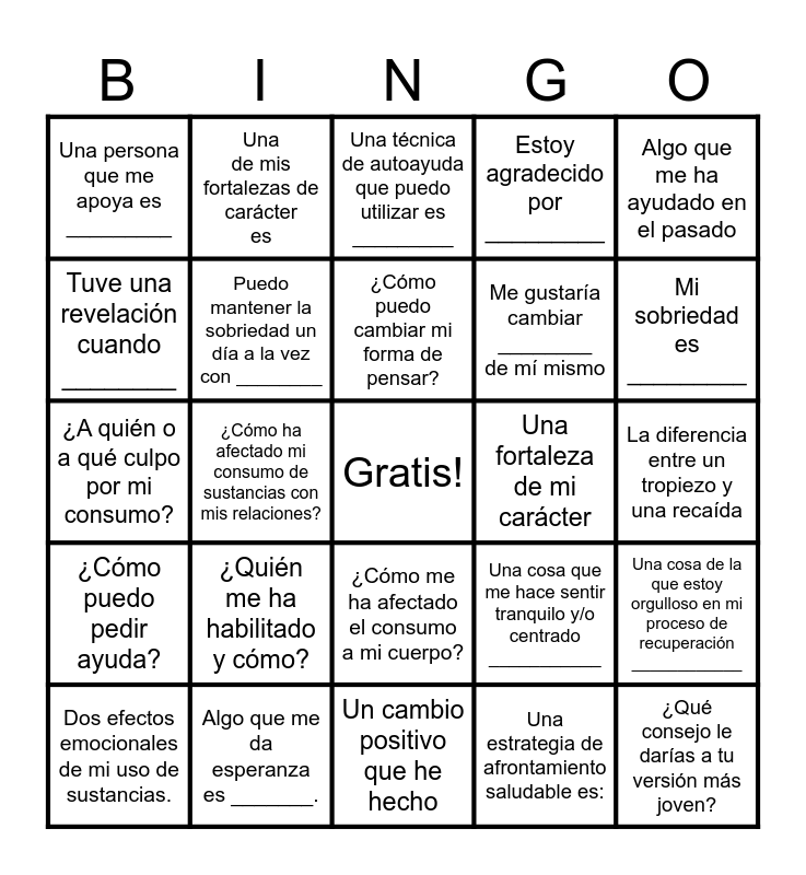 This bingo card has a free space and 24 words: ¿Quién me ha habilitado y cómo?, Algo que me da esperanza es _______., ¿Cómo puedo cambiar mi forma de pensar?, Dos efectos emocionales de mi uso de sustancias., Algo que me ha ayudado en el pasado, Una persona que me apoya es _________, Tuve una revelación cuando ________, Una de mis fortalezas de carácter es, Una fortaleza de mi carácter, ¿Cómo me ha afectado el consumo a mi cuerpo?, Me gustaría cambiar ________ de mí mismo, ¿A quién o a qué culpo por mi consumo?, Una cosa que me hace sentir tranquilo y/o centrado ___________, Una cosa de la que estoy orgulloso en mi proceso de recuperación ____________, Puedo mantener la sobriedad un día a la vez con ________, Una estrategia de afrontamiento saludable es:, La diferencia entre un tropiezo y una recaída, Una técnica de autoayuda que puedo utilizar es _________, Mi sobriedad es _________, ¿Cómo ha afectado mi consumo de sustancias con mis relaciones?, ¿Qué consejo le darías a tu versión más joven?, ¿Cómo puedo pedir ayuda?, Estoy agradecido por _________ and Un cambio positivo que he hecho.