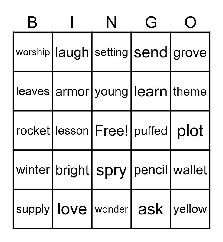 This bingo card has a free space and 24 words: bright, love, young, supply, grove, worship, leaves, laugh, puffed, spry, learn, rocket, pencil, wallet, armor, ask, plot, setting, theme, lesson, yellow, winter, send and wonder.