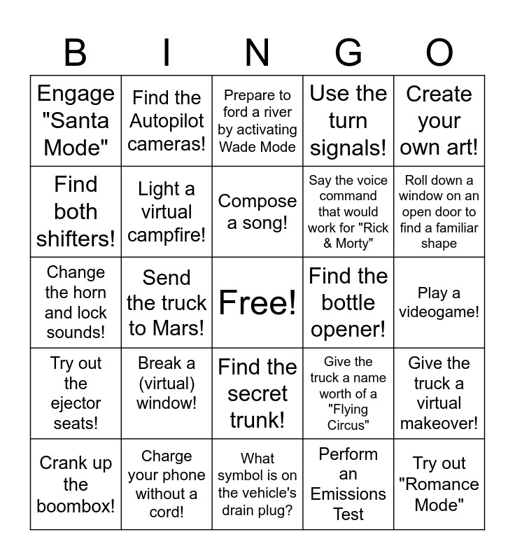 This bingo card has a free space and 24 words: Break a (virtual) window!, Charge your phone without a cord!, Compose a song!, Crank up the boombox!, Create your own art!, Engage "Santa Mode", Find both shifters!, Find the Autopilot cameras!, Find the bottle opener!, Find the secret trunk!, Say the voice command that would work for "Rick & Morty", Change the horn and lock sounds!, Give the truck a name worth of a "Flying Circus", Give the truck a virtual makeover!, Light a virtual campfire!, Perform an Emissions Test, Play a videogame!, Prepare to ford a river by activating Wade Mode, Roll down a window on an open door to find a familiar shape, Send the truck to Mars!, Try out "Romance Mode", Try out the ejector seats!, Use the turn signals! and What symbol is on the vehicle's drain plug?.