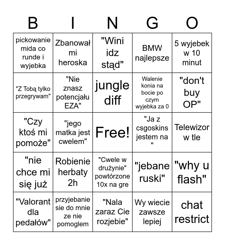 This bingo card has a free space and 25 words: Robienie herbaty 2h, "Nala zaraz Cie rozjebie", jungle diff, "Valorant dla pedałów", 5 wyjebek w 10 minut, pickowanie mida co runde i wyjebka, "Z Tobą tylko przegrywam", Zbanował mi heroska, "Ja z csgoskins jestem na ", "Cwele w drużynie" powtórzone 10x na gre, Walenie konia na bocie po czym wyjebka za 0, "Czy ktoś mi pomoże", "jebane ruski", "why u flash", "Nie znasz potencjału EZA", "caitlyn instalock na mida", Telewizor w tle, "Wini idz stąd", "don't buy OP", "jego matka jest cwelem", chat restrict, przyjebanie sie do mnie ze nie pomoglem, "nie chce mi się już, BMW najlepsze and Wy wiecie zawsze lepiej.
