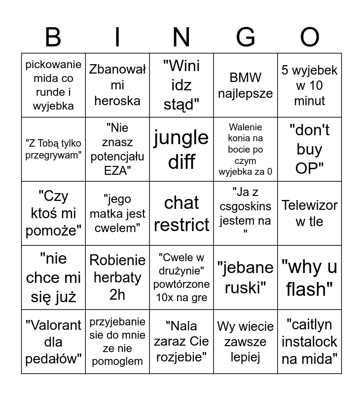 This bingo card has 25 words: Robienie herbaty 2h, "Nala zaraz Cie rozjebie", jungle diff, "Valorant dla pedałów", 5 wyjebek w 10 minut, pickowanie mida co runde i wyjebka, "Z Tobą tylko przegrywam", Zbanował mi heroska, "Ja z csgoskins jestem na ", "Cwele w drużynie" powtórzone 10x na gre, Walenie konia na bocie po czym wyjebka za 0, "Czy ktoś mi pomoże", "jebane ruski", "why u flash", "Nie znasz potencjału EZA", "caitlyn instalock na mida", Telewizor w tle, "Wini idz stąd", "don't buy OP", "jego matka jest cwelem", chat restrict, przyjebanie sie do mnie ze nie pomoglem, "nie chce mi się już, BMW najlepsze and Wy wiecie zawsze lepiej.