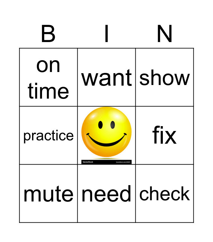 This bingo card has a free space and 8 words: fix, show, want, mute, on time, check, practice and need.