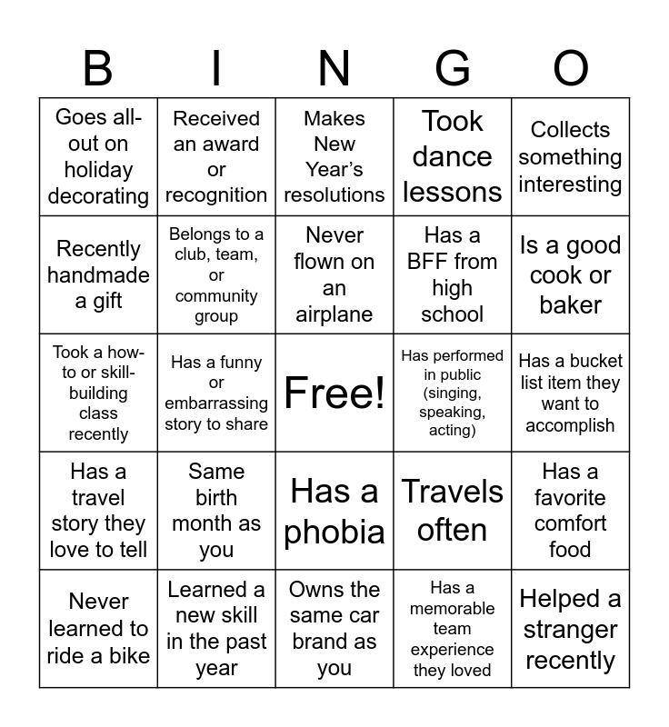 This bingo card has a free space and 25 words: Same birth month as you, Owns the same car brand as you, Never flown on an airplane, Never learned to ride a bike, Collects something interesting, Goes all-out on holiday decorating, Recently handmade a gift, Received an award or recognition, Has performed in public (singing, speaking, acting), Has a phobia, Has a BFF from high school, Took a how-to or skill-building class recently, Travels often, Has a favorite comfort food, Belongs to a club, team, or community group, Has a nickname, Has a bucket list item they want to accomplish, Makes New Year’s resolutions, Is a good cook or baker, Has a funny or embarrassing story to share, Helped a stranger recently, Learned a new skill in the past year, Has a travel story they love to tell, Took dance lessons and Has a memorable team experience they loved.