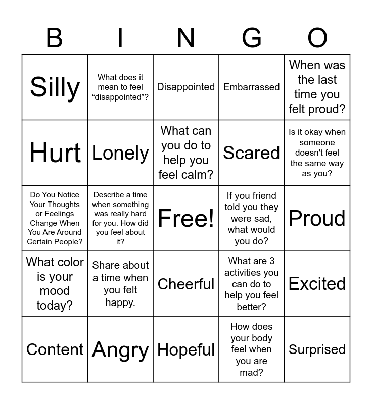 This bingo card has a free space and 24 words: Share about a time when you felt happy., Angry, What can you do to help you feel calm?, Content, When was the last time you felt proud?, Silly, Hurt, What does it mean to feel “disappointed”?, If you friend told you they were sad, what would you do?, Cheerful, Scared, Do You Notice Your Thoughts or Feelings Change When You Are Around Certain People?, What are 3 activities you can do to help you feel better?, Excited, Lonely, How does your body feel when you are mad?, Proud, Disappointed, Is it okay when someone doesn't feel the same way as you?, Describe a time when something was really hard for you. How did you feel about it?, Surprised, What color is your mood today?, Embarrassed and Hopeful.