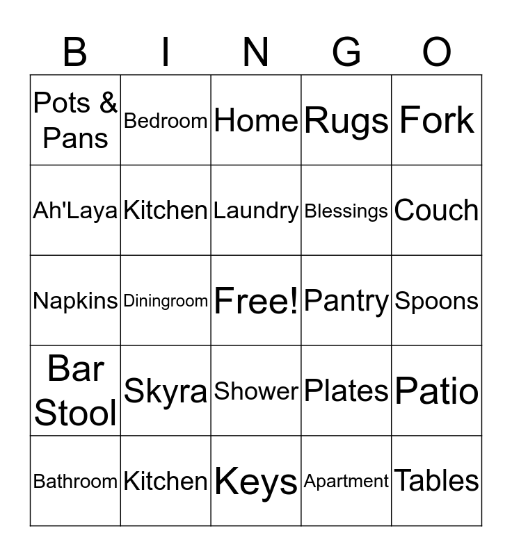 This bingo card has a free space and 24 words: Skyra, Kitchen, Laundry, Bathroom, Fork, Pots & Pans, Ah'Laya, Bedroom, Pantry, Shower, Blessings, Napkins, Plates, Patio, Kitchen, Apartment, Spoons, Home, Couch, Diningroom, Tables, Bar Stool, Rugs and Keys.