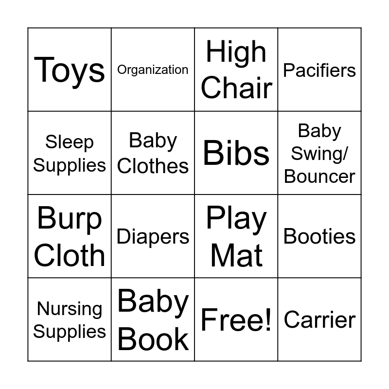 This bingo card has 17 words: Free!, Nursing Supplies, High Chair, Toys, Diapers, Pacifiers, Booties, Bibs, Baby Swing/ Bouncer, Baby Clothes, Baby Book, Play Mat, Sleep Supplies, Organization, Burp Cloth, Bath Supplies and Carrier.