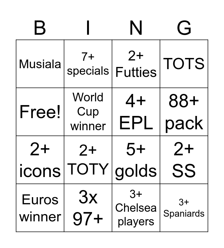 This bingo card has 16 words: 3x 97+, 2+ SS, 2+ Futties, Musiala, 2+ icons, 7+ specials, 5+ golds, 3+ Chelsea players, Free!, World Cup winner, Euros winner, TOTS, 2+ TOTY, 88+ pack, 4+ EPL and 3+ Spaniards.