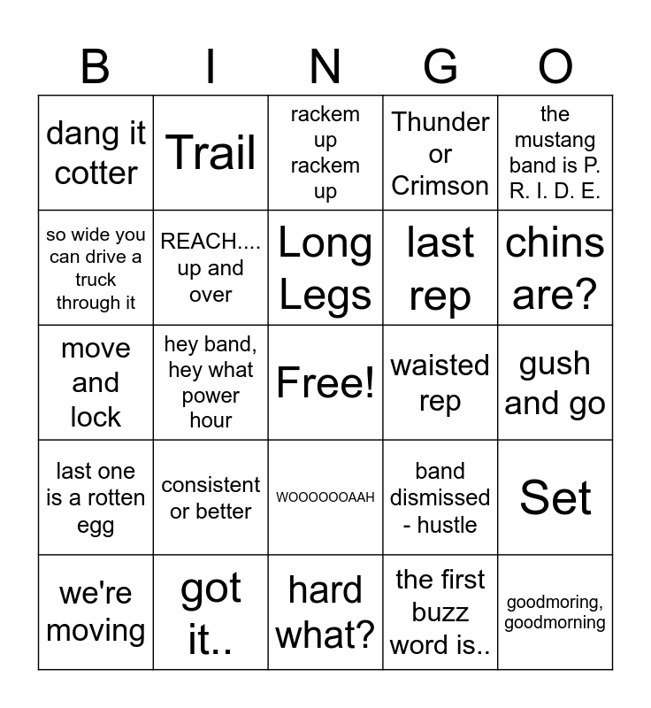 This bingo card has a free space and 29 words: we're moving, from good to great, hey band, hey what power hour, chairs and stands, dang it cotter, rackem up rackem up, REACH.... up and over, consistent or better, waisted rep, got it.., gush and go, goodmoring, goodmorning, hard what?, the first buzz word is.., chins are?, directors whistle, WOOOOOOAAH, last one is a rotten egg, the mustang band is P. R. I. D. E., move and lock, band dismissed - hustle, I will.., last rep, so wide you can drive a truck through it, Thunder or Crimson, Trail, Set, Long Legs and Ding-Dong.