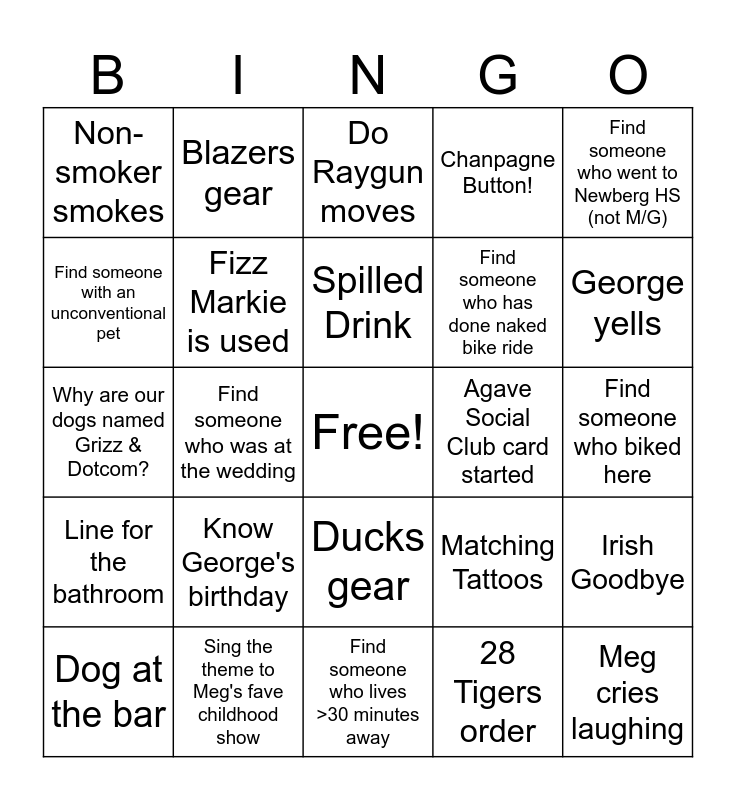 This bingo card has a free space and 28 words: Irish Goodbye, Partygoer does a shot, Find someone who has done naked bike ride, 28 Tigers order, Find someone with an unconventional pet, Do Raygun moves, Blazers gear, Line for the bathroom, Agave Social Club card started, Dog at the bar, Why are our dogs named Grizz & Dotcom?, Chanpagne Button!, Sing the theme to Meg's fave childhood show, Find someone who lives >30 minutes away, George yells, Find someone who went to U of O (not Meg), Know George's birthday, Fizz Markie is used, Spilled Drink, Ducks gear, Non-smoker smokes, Will Ferrell quote, Meg cries laughing, Find someone who was at the wedding, Find someone who biked here, Matching Tattoos, Find someone who went to Newberg HS (not M/G) and Pan con Queso order.